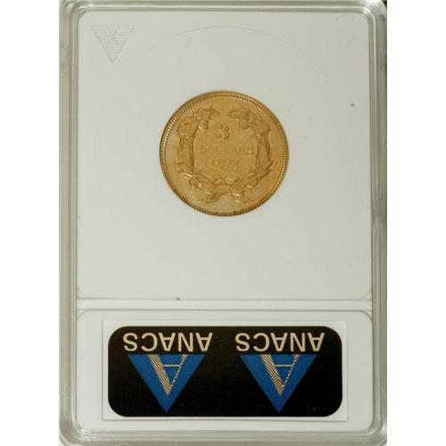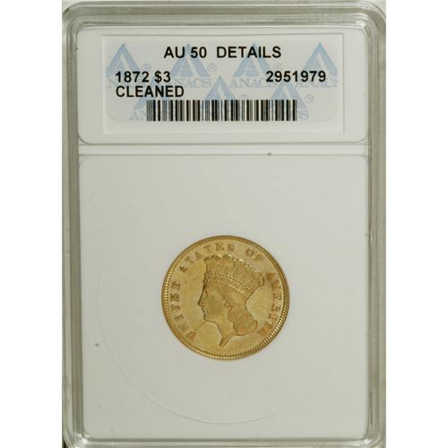 <B>1872 $3 --Cleaned--ANACS. AU50 Details.</B></I> The orange and lime patina largely conceals the faint hairlines. A diagonal pinscratch ascends through the 7 in the date, and lesser thin marks are noted on both exergues. Still desirable due to a low mintage of 2,000 pieces.<BR><I>From The Stecher Collection, Part Two.</B></I><BR><BR><b>Shipping:</b> Coins & Currency (<a target="_blank" href="http://www.heritageauctions.com/common/shipping.php">view shipping information</a>)