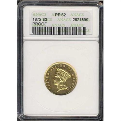 <b>1872 $3 Gold. ANACS graded Proof 62.</b> We are privileged to offer a two-tone contrast Proof example of this extremely rare 1872 $3 at this sale, and when one considers the few survivors likely from a Proof mintage of just 30 pieces, it begins to dawn on everyone that this is no throwaway statement. While it may be the lesser quality coin in "only" Proof 62, the coin itself requires no apologies in the aesthetic feature of eye-appeal. Toned yet still smooth and sassy appearing with a lot of life, the expected orange-peel fields still can be found plus lightly frosted devices, the net effect being the aforementioned two-tone effect. A coin that would please even if the date were not so rare. The usual scattered light hairlines.