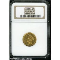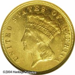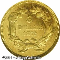 1872 $3 MS61 NGC. Ex: Reed. A nicely struck and mo <B>1872 $3 MS61 NGC.</B></I> Ex: Reed. A nicely struck and moderately prooflike piece with luminous peach patina and no unattractive handling marks. Only 3,000 pieces were struck. Byron Reed was a 19th century real estate magnate whose holdings included an 1804 Dollar, currently on display at the Western Heritage Museum in Omaha, Nebraska. Population: 10 in 61, 14 finer (10/04).<BR><I>Ex: Byron Reed Collection (Christie's, 10/96), lot 85.</B></I> <BR><BR><B>Important notice:</B> Heritage usually auctions material at the rate of 200-250 lots per hour. On some occasions eBay Live bid software or the Internet may not be able to keep up with the pace of the auction. We recommend placing a realistic absentee bid now as insurance to avoid disappointment. Occasionally the auctioneer may eliminate or reject an eBay Live bid, and the auctioneer may also reopen a lot after the close of the eBay live bidding (usually because we missed an audience bid), and may reject your bid even if it shows you as the winning bidder. By bidding via eBay Live, you agree that Heritage may award the lot to another bidder at its sole discretion under the circumstances described above or any other reasonable circumstances. Since eBay bids are not shown to us until we open the lot on the floor, we treat those bids just like floor bids. In most cases the floor responds before the eBay bid is presented to us, due to Internet lag time, so for consistency we have made it a policy that floor bids are always considered first over tie eBay live bids. Also please note that all Heritage lots purchased through eBay Live carry a 20% Buyer's Premium. Please make sure you read the Terms and Conditions before you bid. This lot is being auctioned in conjunction with a live floor auction by Heritage Galleries & Auctioneers. All final auction and invoice information will be supplied by Heritage Galleries & Auctioneers, and all other information should be considered preliminary. Lot:6608
