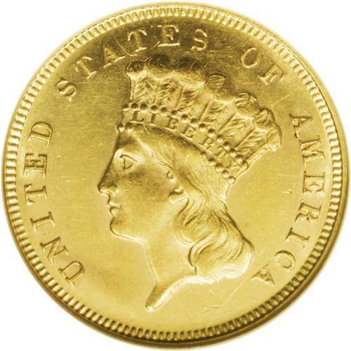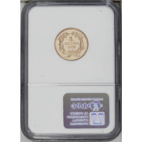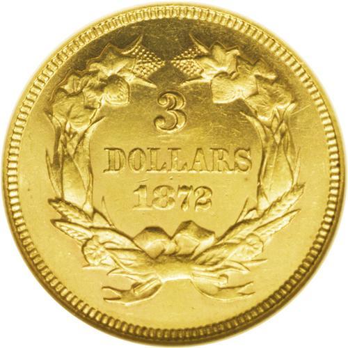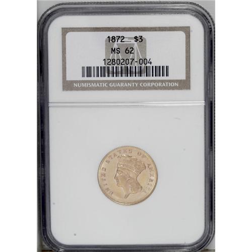 <B>1872<$3> MS62 NGC.</B></I> An intensely prooflike piece with deeply mirrored yellow-gold fields, perhaps not surprisingly for a circulation-strike mintage of only 2,000 coins. All examples of this issue are rare today. Light field chatter shows under a loupe, accounting for the grade, along with a couple of pinscratches through CA. Some curious die bulging shows in the area before the bust truncation and through UN of UNITED. Census: 10 in 62, 5 finer (9/06).<BR><I>From The Tide Collection.</B></I>