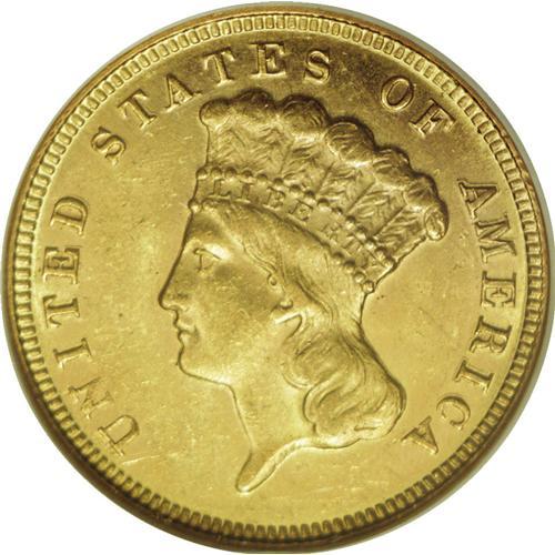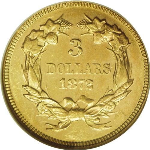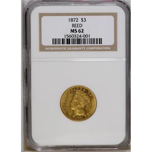 <B>1872 $3 MS62 NGC.</B></I> Ex: Reed. This low-mintage issue is an important rarity among coins of this denomination, with a total production that was limited to 2,000 coins. Mint State examples of this date are especially elusive, although a limited number of serious date collectors has kept prices at moderate levels. A similar rarity in a series such as Liberty double eagles, for example, would fetch a comparatively huge price. This cameo example has pleasing orange-gold color with frosted devices and fully mirrored fields. The surfaces exhibit a few light marks, but none of any significance. Census: 11 in 62, 5 finer (12/06).<BR><I>Ex: Byron Reed Collection (Christie's, 10/1996), lot 85.</B></I><BR><BR><b>Shipping:</b> Coins & Currency (<a target="_blank" href="http://www.heritageauctions.com/common/shipping.php">view shipping information</a>)