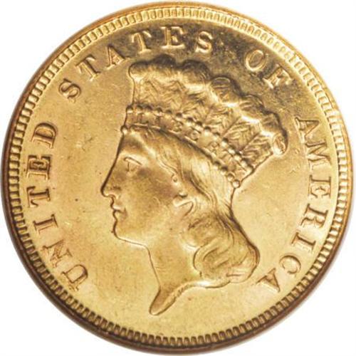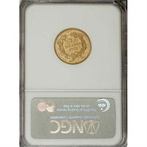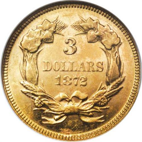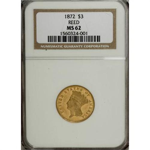 <B>1872 $3 MS62 NGC.</B></I> Ex: Reed. This low-mintage issue is an important rarity among coins of this denomination, with a total production that was limited to 2,000 coins. Mint State examples of this date are especially elusive, although a limited number of serious date collectors has kept prices at reasonable levels. A similar rarity in a series such as Liberty double eagles, for example, would fetch a comparatively huge price. This cameo example has pleasing orange-gold color with frosted devices and fully mirrored fields. The surfaces exhibit a few light marks, but none of any significance. Census: 11 in 62, 5 finer (6/07).<BR><I>Ex: Byron Reed Collection (Christie's, 10/1996), lot 85.</B></I><BR><I>From The DAX Collection.</B></I><BR><BR><B>Coin Engraver:</B> James B. Longacre<BR><BR><b>Shipping:</b> Coins & Currency (<a target="_blank" href="http://www.heritageauctions.com/common/shipping.php">view shipping information</a>\)