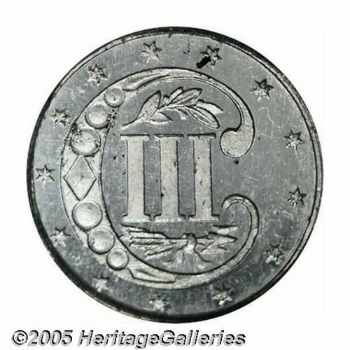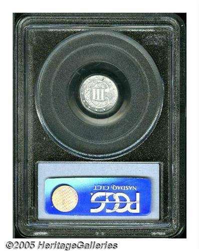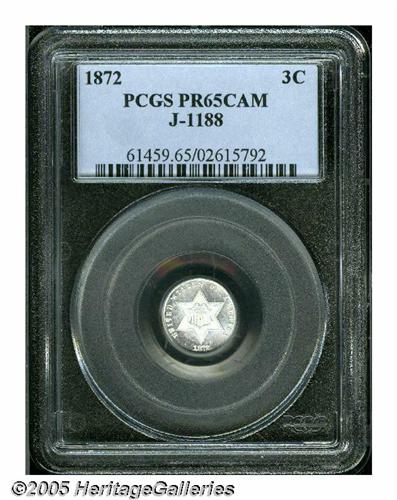 <B>1872<3C> Three Cent Silver, Judd-1188, Pollock-1328, High R.7, PR65 Cameo PCGS.</B></I> Regular die trials striking, produced in aluminum with a plain edge. Deeply mirrored with a few trivial flecks of carbon on the reverse. A finer specimen is not likely to survive.<BR><I>From The Western Hills Collection.</B></I>