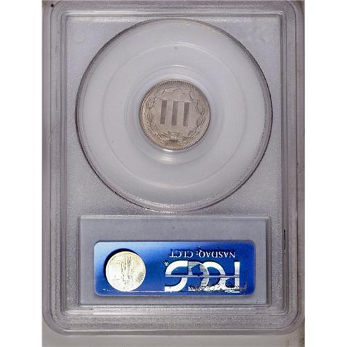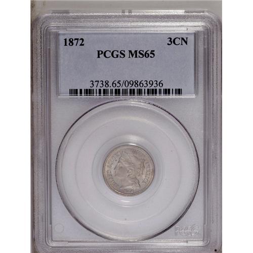 <B>1872<3CN> MS65 PCGS.</B></I> A satiny Gem with powder-blue and olive tints. Nicely struck and smooth. A faint gray spot is noted beneath the second T in STATES. A scarce date in high Mint State grades. Ample portions of the wreath are absent, as made from a lapped reverse die. Population: 17 in 65, 13 finer (2/06).