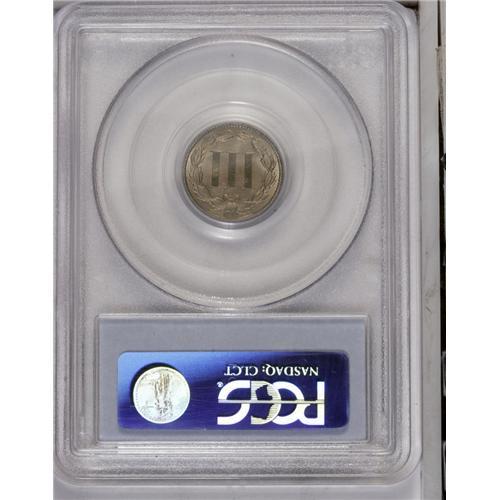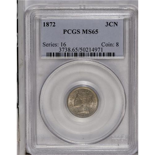 <B>1872<3CN> MS65 PCGS.</B></I> Attractive Gem example with slightly matte surfaces and faint rose-yellow color. Only the smallest flaws are evident under very close inspection. Population: 17 in 65, 12 finer (7/06).