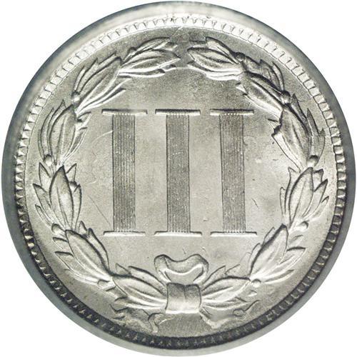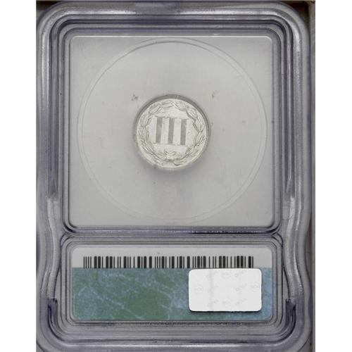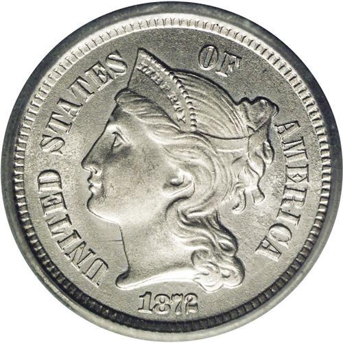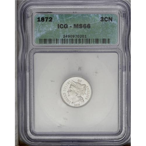 <B>1872<3CN> MS66 ICG.</B></I> The design details are fully struck, while surrounded by fields that exhibit a mildly granular texture indicative of minor die wear. Faint die clash marks are also evident within the obverse and reverse field areas. The essentially pearl-gray coloration has some faint rosy undertones. Exquisitely preserved, this visually bewitching Premium Gem seems pristine.