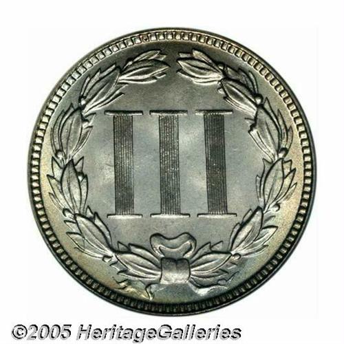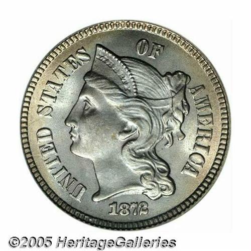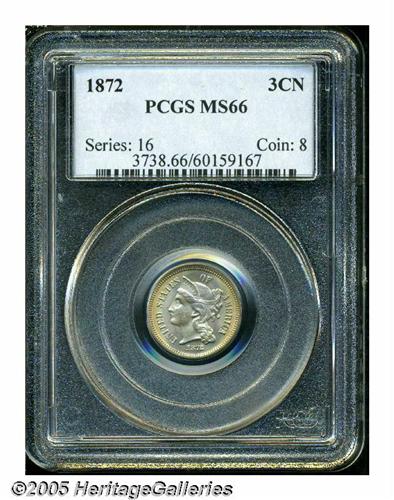<B>1872<3CN> MS66 PCGS.</B></I> Boldly struck with swirling golden and blue pastel hues that lend of touch of originality to this wondrously preserved, frosty example. Rarely seen so fine. Population: 9 in 66, 0 finer (4/05).<BR><I>From The Western Hills Collection.</B></I>