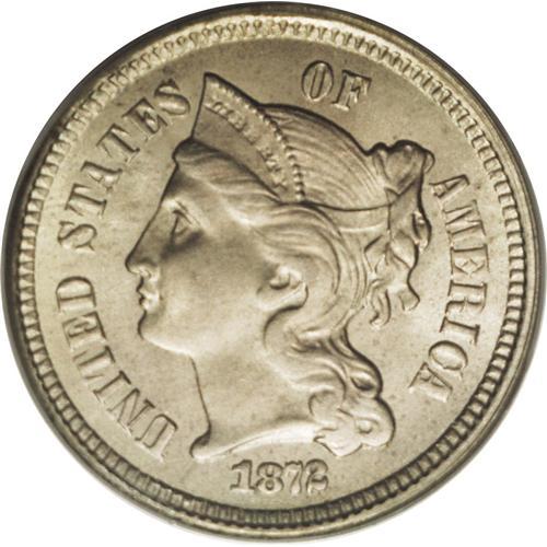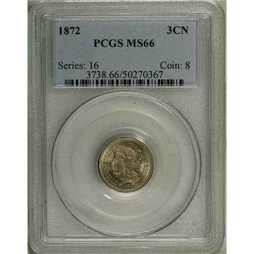 <B>1872 3CN MS66 PCGS.</B></I> Delicate honey-gold patina adorns this lustrous and remarkably smooth Premium Gem. The strike is good, although incomplete on the shoulder curls and on the center of the initial column. A lovely coin that should please even the most demanding collector. Population: 11 in 66, 0 finer (11/06).<BR><BR><b>Shipping:</b> Coin/Currency (<a target="_blank" href="http://www.heritageauctions.com/common/shipping.php">view shipping information</a>)