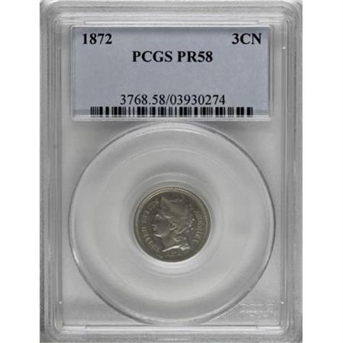 <B>1872 3CN PR58 PCGS.</B></I> PCGS Population (3/322). NGC Census: (0/321). Mintage: 950. (#3768)<BR><BR><B>Coin Engraver:</B> James B. Longacre<BR><BR><b>Shipping:</b> Coins & Currency (<a target="_blank" href="http://www.heritageauctions.com/common/shipping.php">view shipping information</a>)