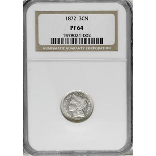 <B>1872 3CN PR64 NGC.</B></I> . NGC Census: (136/149). PCGS Population (154/103). Mintage: 950. Numismedia Wsl. Price for NGC/PCGS coin in PR64: $340. (#3768)<BR><BR><B>Coin Engraver:</B> James B. Longacre<BR><BR><b>Shipping:</b> Coins & Currency (<a target="_blank" href="http://www.heritageauctions.com/common/shipping.php">view shipping information</a>)