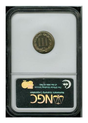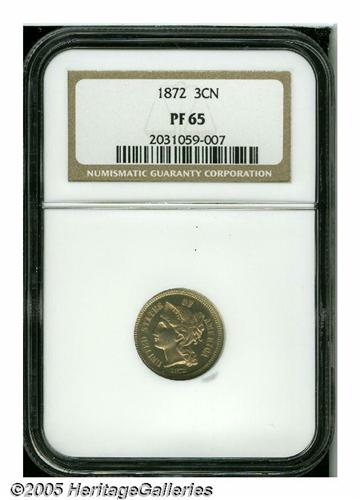 <B>1872<3CN> PR65 NGC.</B></I> A whisper of beige-gold patina visits each side, and the design elements are well struck, with great definition on the lines of the III. A couple of trivial marks on Liberty's temple and cheek are not bothersome. NGC has certified just 20 specimens higher (3/05).