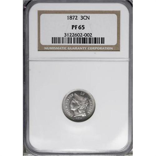 <B>1872 3CN PR65 NGC.</B></I> NGC Census: (128/20). PCGS Population (87/16). Mintage: 950. Numismedia Wsl. Price for NGC/PCGS coin in PR65: $820. (#3768)<BR><BR><B>Coin Engraver:</B> James B. Longacre<BR><BR><b>Shipping:</b> Coins & Currency (<a target="_blank" href="http://www.heritageauctions.com/common/shipping.php">view shipping information</a>)