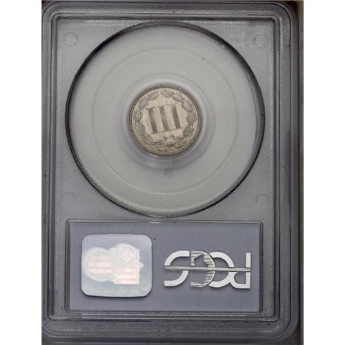 <B>1872<3CN> PR65 PCGS.</B></I> Bright proof surfaces exhibit well struck design features and are devoid of any mentionable contact marks. Several pepper-like charcoal-gray spots are distributed over each side. Population: 88 in 65, 15 finer (4/06).