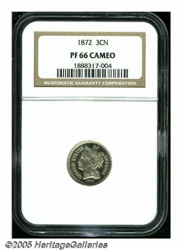 <B>1872<3CN> PR66 Cameo NGC.</B></I> Attractive cameo example with dynamically frosted devices that look slightly grainy, and attractive mirrors that hold expectedly few problems.