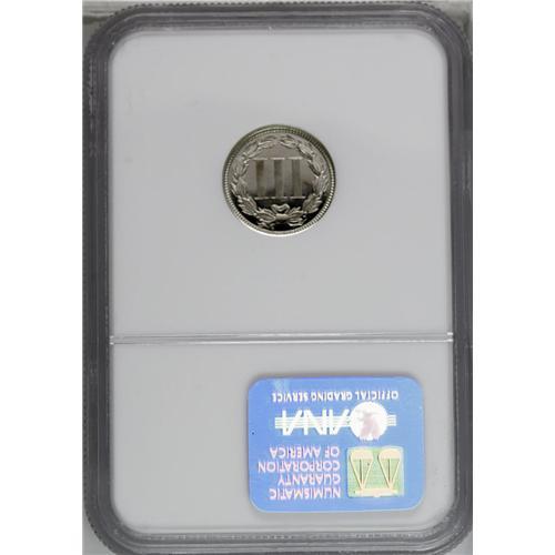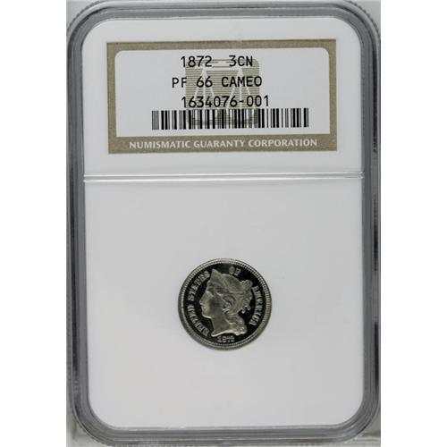 <B>1872<3CN> PR66 Cameo NGC.</B></I> Exquisitely struck design elements are complemented by pronounced field-motif contrast. Subtle hints of dappled milky-tan color dot each side. A few trivial contact marks on the obverse portrait are interspersed with some minor granular strike incompleteness. Census: 18 in 66, 1 finer (4/06).