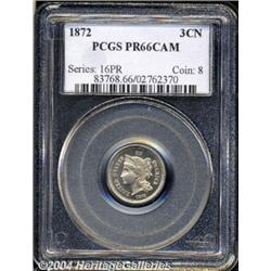 <B>1872<3CN> PR66 Cameo PCGS.</B></I> Faint gray-gold speckles grace both sides of this lovely cameo, whose surfaces are virtually free of distracting marks. Population: 3 in 66, 0 finer (3/04). <BR><BR><B>Important notice:</B> Heritage usually auctions material at the rate of 200-250 lots per hour. On some occasions eBay Live bid software or the Internet may not be able to keep up with the pace of the auction. We recommend placing a realistic absentee bid now as insurance to avoid disappointment. Occasionally the auctioneer may eliminate or reject an eBay Live bid, and the auctioneer may also reopen a lot after the close of the eBay live bidding (usually because we missed an audience bid), and may reject your bid even if it shows you as the winning bidder. By bidding via eBay Live, you agree that Heritage may award the lot to another bidder at its sole discretion under the circumstances described above or any other reasonable circumstances. Since eBay bids are not shown to us until we open the lot on the floor, we treat those bids just like floor bids. In most cases the floor responds before the eBay bid is presented to us, due to Internet lag time, so for consistency we have made it a policy that floor bids are always considered first over tie eBay live bids. Also please note that all Heritage lots purchased through eBay Live carry a 20% Buyer's Premium. Please make sure you read the Terms and Conditions before you bid.