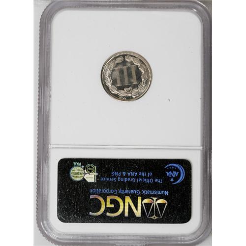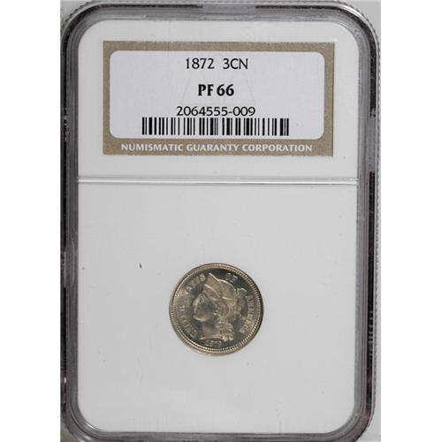 <B>1872<3CN> PR66 NGC.</B></I> A gleaming gold-gray proof that has great mirrors for this issue and a wealth of detail. Two small carbon spots appear at the obverse rim, one at 4 o'clock, the other at 5.