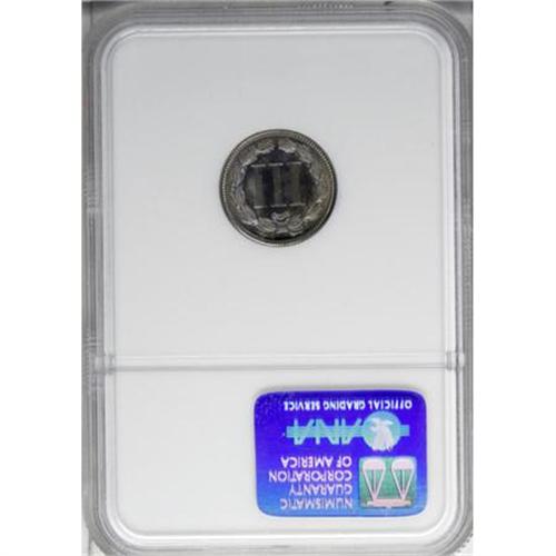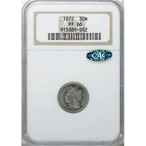<B>1872 3CN PR66 NGC. CAC.</B></I> Faint ice-blue and tan-beige color adorns well preserved surfaces. Minor softness is seen in the middle lines of the first upright of the III. Census: 20 in 66, 0 finer (1/08).<BR><I>From The Southwest Collection.</B></I><BR><BR><B>Coin Engraver:</B> James B. Longacre<BR><BR><b>Shipping:</b> Coins & Currency (<a target="_blank" href="http://www.heritageauctions.com/common/shipping.php">view shipping information</a>)