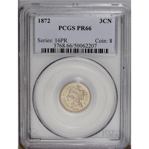 <B>1872<3CN> PR66 PCGS.</B></I> Especially well mirrored and totally void of carbon beneath delicate golden patina. Certainly in the top echelon of surviving proofs from this year. Population: 15 in 66, 0 finer (3/06). <BR><BR><B>Important notice:</B> Heritage usually auctions material at the rate of 200-250 lots per hour. On some occasions eBay Live bid software or the Internet may not be able to keep up with the pace of the auction. We recommend placing a realistic absentee bid now as insurance to avoid disappointment. Occasionally the auctioneer may eliminate or reject an eBay Live bid, and the auctioneer may also reopen a lot after the close of the eBay live bidding (usually because we missed an audience bid), and may reject your bid even if it shows you as the winning bidder. By bidding via eBay Live, you agree that Heritage may award the lot to another bidder at its sole discretion under the circumstances described above or any other reasonable circumstances. Since eBay bids are not shown to us until we open the lot on the floor, we treat those bids just like floor bids. In most cases the floor responds before the eBay bid is presented to us, due to Internet lag time, so for consistency we have made it a policy that floor bids are always considered first over tie eBay live bids. Also please note that all Heritage lots purchased through eBay Live carry a 20% Buyer's Premium. Please make sure you read the Terms and Conditions before you bid. This lot is being auctioned in conjunction with a live floor auction by Heritage Galleries & Auctioneers. All final auction and invoice information will be supplied by Heritage Galleries & Auctioneers, and all other information should be considered preliminary. Lot:808 <BR><BR><B>Winning Notification and Billing:</B> After the FINAL session in this auction is complete, Heritage will send e-mail and snail mail invoices. This process normally takes several days. All final auction and invoice information will be supplied by Heritage Galleries & Auctioneers, and all other information should be considered preliminary. <BR><BR>This auction will be conducted on a live auction floor and over the Internet through eBay Live. If you choose to place an absentee bid, please take a moment to <font color='#0000ff'><u><a href='http://pages.ebay.com/liveauctions/help/before/laabsentee.html'>learn how eBay Live absentee bidding works</a></u></font><font color='#000000'>