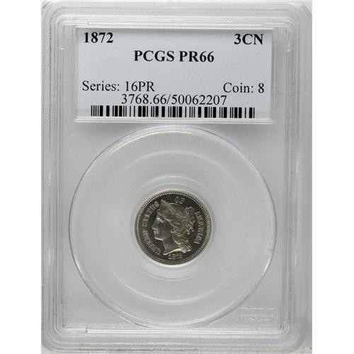 1872 3CN PR66 PCGS. Especially well mirrored and total