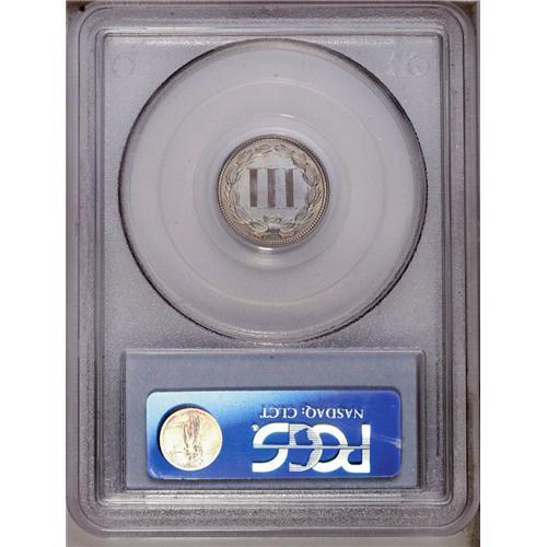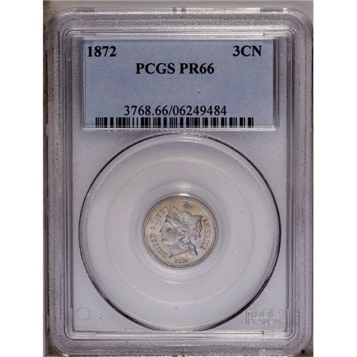 <B>1872<3CN> PR66 PCGS.</B></I> Splashes of pale blue and apricot toning infiltrate both sides. While PR65 specimens make frequent appearances in our auctions, there are surprisingly few pieces certified at this level. Population: 15 in 66, 0 finer (3/06). <BR><BR><B>Important notice:</B> Heritage usually auctions material at the rate of 200-250 lots per hour. On some occasions eBay Live bid software or the Internet may not be able to keep up with the pace of the auction. We recommend placing a realistic absentee bid now as insurance to avoid disappointment. Occasionally the auctioneer may eliminate or reject an eBay Live bid, and the auctioneer may also reopen a lot after the close of the eBay live bidding (usually because we missed an audience bid), and may reject your bid even if it shows you as the winning bidder. By bidding via eBay Live, you agree that Heritage may award the lot to another bidder at its sole discretion under the circumstances described above or any other reasonable circumstances. Since eBay bids are not shown to us until we open the lot on the floor, we treat those bids just like floor bids. In most cases the floor responds before the eBay bid is presented to us, due to Internet lag time, so for consistency we have made it a policy that floor bids are always considered first over tie eBay live bids. Also please note that all Heritage lots purchased through eBay Live carry a 20% Buyer's Premium. Please make sure you read the Terms and Conditions before you bid. This lot is being auctioned in conjunction with a live floor auction by Heritage Galleries & Auctioneers. All final auction and invoice information will be supplied by Heritage Galleries & Auctioneers, and all other information should be considered preliminary. Lot:807 <BR><BR><B>Winning Notification and Billing:</B> After the FINAL session in this auction is complete, Heritage will send e-mail and snail mail invoices. This process normally takes several days. All final auction and invoice information will be supplied by Heritage Galleries & Auctioneers, and all other information should be considered preliminary. <BR><BR>This auction will be conducted on a live auction floor and over the Internet through eBay Live. If you choose to place an absentee bid, please take a moment to <font color='#0000ff'><u><a href='http://pages.ebay.com/liveauctions/help/before/laabsentee.html'>learn how eBay Live absentee bidding works</a></u></font><font color='#000000'>