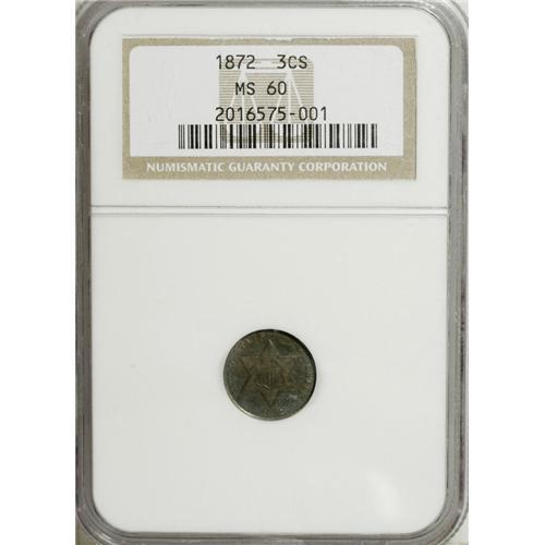 <B>1872 3CS MS60 NGC.</B></I> Well struck with opaque gunmetal and rose-gray patina overall. Light abrasions pepper each side, though a single dig below the A in STATES defines the grade. One of only 1,000 business strikes minted.<BR><BR><b>Shipping:</b> Coins & Currency (<a target="_blank" href="http://www.heritageauctions.com/common/shipping.php">view shipping information</a>)
