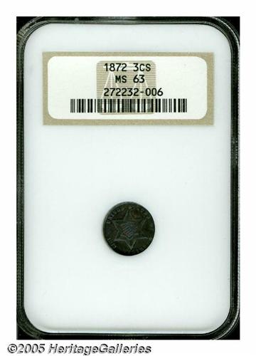 <B>1872<3CS> MS63 NGC.</B></I> Mottled lilac, cobalt-blue, and golden-brown toning with a nice strike and no significant contact marks. A very scarce issue with a total mintage of only 1,950 pieces (1,000 business strikes).