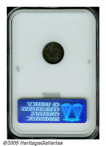 1872 3CS MS63 NGC. Mottled lilac, cobalt-blue, an