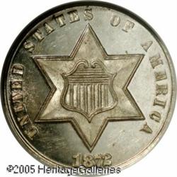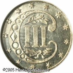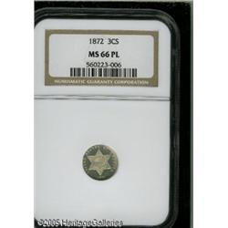 <B>1872 3CS MS66 Prooflike NGC.</B></I> A snowy-white, fully prooflike specimen given added eye appeal by the frosty central devices. Only 1,000 business strikes were issued and few survive in such superior condition. A rare opportunity for the collector of this diminutive issue. Population: 4 in 66, 0 finer (1/05). Lot:5670