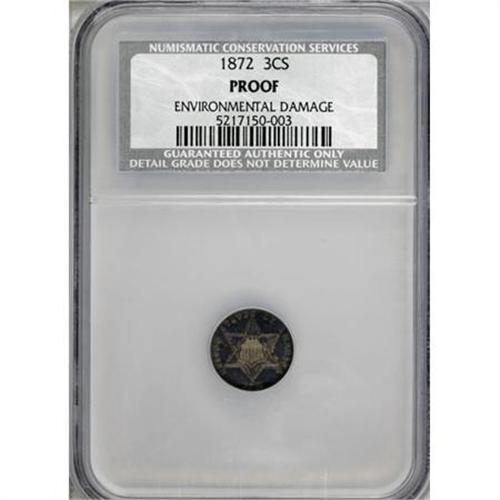 <B>1872 3CS --Environmental Damage--NCS. Proof.</B></I> NGC Census: (0/0). PCGS Population (0/0). Mintage: 950. (#3723)<BR><BR><B>Coin Engraver:</B> James B. Longacre<BR><BR><b>Shipping:</b> Coins & Currency (<a target="_blank" href="http://www.heritageauctions.com/common/shipping.php">view shipping information</a>)