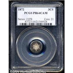 <B>1872<3CS> PR64 Cameo PCGS.</B></I> Well struck with light die clash marks (as struck), and die striations (also as struck), on each side, and beautiful electric-green, russet-brown, and golden-yellow iridescence decorating both sides of the coin. Population: 6 in 64 Cameo, 4 finer (3/04). <BR><BR><B>Important notice:</B> Heritage usually auctions material at the rate of 200-250 lots per hour. On some occasions eBay Live bid software or the Internet may not be able to keep up with the pace of the auction. We recommend placing a realistic absentee bid now as insurance to avoid disappointment. Occasionally the auctioneer may eliminate or reject an eBay Live bid, and the auctioneer may also reopen a lot after the close of the eBay live bidding (usually because we missed an audience bid), and may reject your bid even if it shows you as the winning bidder. By bidding via eBay Live, you agree that Heritage may award the lot to another bidder at its sole discretion under the circumstances described above or any other reasonable circumstances. Since eBay bids are not shown to us until we open the lot on the floor, we treat those bids just like floor bids. In most cases the floor responds before the eBay bid is presented to us, due to Internet lag time, so for consistency we have made it a policy that floor bids are always considered first over tie eBay live bids. Also please note that all Heritage lots purchased through eBay Live carry a 20% Buyer's Premium. Please make sure you read the Terms and Conditions before you bid.