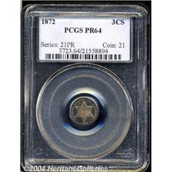 <B>1872<3CS> PR64 PCGS.</B></I> Well struck with nice reflectivity in the fields, the absence of any appreciable blemishes, and no obvious evidence of die clashing, with a coating of beautiful deep cobalt-blue, apricot-brown, and purple coloration on both sides. Population: 81 in 64, 41 finer (3/04).<BR><I>Ex: Quality Sales Corp. Sale (11/68), lot 1300, where it sold for $105.</B></I> <BR><BR><B>Important notice:</B> Heritage usually auctions material at the rate of 200-250 lots per hour. On some occasions eBay Live bid software or the Internet may not be able to keep up with the pace of the auction. We recommend placing a realistic absentee bid now as insurance to avoid disappointment. Occasionally the auctioneer may eliminate or reject an eBay Live bid, and the auctioneer may also reopen a lot after the close of the eBay live bidding (usually because we missed an audience bid), and may reject your bid even if it shows you as the winning bidder. By bidding via eBay Live, you agree that Heritage may award the lot to another bidder at its sole discretion under the circumstances described above or any other reasonable circumstances. Since eBay bids are not shown to us until we open the lot on the floor, we treat those bids just like floor bids. In most cases the floor responds before the eBay bid is presented to us, due to Internet lag time, so for consistency we have made it a policy that floor bids are always considered first over tie eBay live bids. Also please note that all Heritage lots purchased through eBay Live carry a 20% Buyer's Premium. Please make sure you read the Terms and Conditions before you bid.