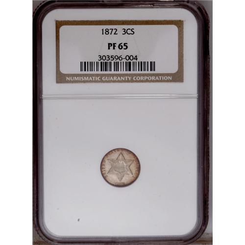 <B>1872<3CS> PR65 NGC.</B></I> Rich golden-brown margins bound brilliant centers. This flashy Gem is beautifully preserved, and has only a hint of striking incompletion on the arrow ribbon and shield outlines. Census: 45 in 65, 27 finer (2/06).
