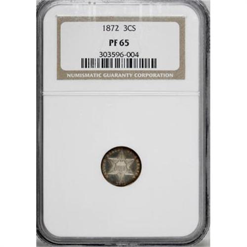 <B>1872 3CS PR65 NGC.</B></I> Rich golden-brown margins surround brilliant centers. This flashy Gem is beautifully preserved, and has only a hint of striking incompletion on the arrow ribbon and shield outlines. Census: 45 in 65, 30 finer (10/07). <BR><BR><B>Coin Engraver:</B> James B. Longacre<BR><BR><b>Shipping:</b> Coins & Currency (<a target="_blank" href="http://www.heritageauctions.com/common/shipping.php">view shipping information</a>)