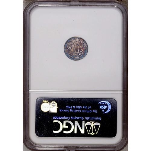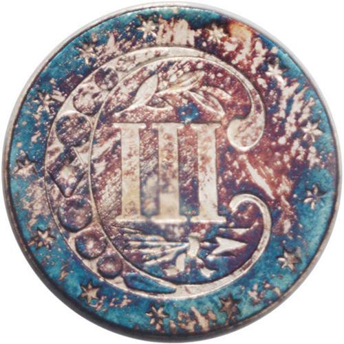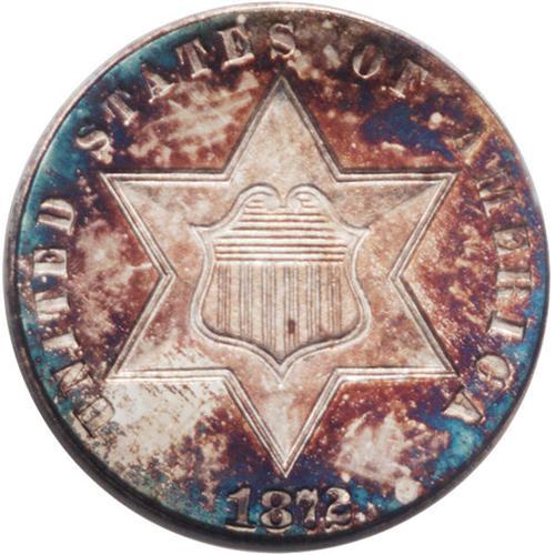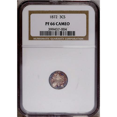 <B>1872<3CS> PR66 Cameo NGC.</B></I> Well struck with light die clash marks and die striations on each side. Beautiful electric-blue and russet-red iridescence overlays the surfaces in a somewhat mottled fashion. A carefully preserved Premium Gem example. Census: 3 in 66 Cameo, 1 finer (1/06).