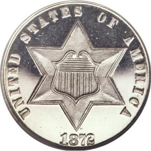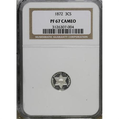 <B>1872 3CS PR67 Cameo NGC.</B></I> The penultimate issue in the three cent silver series, the obverse die was corrected by hand (according to Breen) so the top of the D in UNITED is no longer "broken." This is an atypical Type Three proof. Often seen deeply toned, this piece shows completely brilliant surfaces on each side. The devices are nicely frosted and present a strong cameo contrast against the unfathomable depth of reflectivity seen in the fields. A showcase proof from this popular, odd-denomination series. Census: 1 in 67 Cameo, 0 finer (1/08).<BR><BR><b>Shipping:</b> Coins & Currency (<a target="_blank" href="http://www.heritageauctions.com/common/shipping.php">view shipping information</a>)