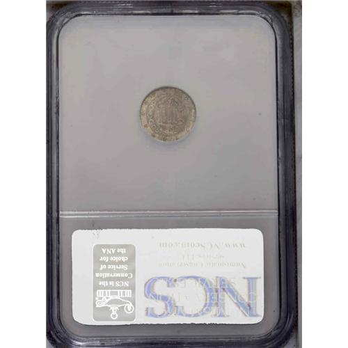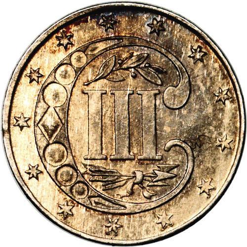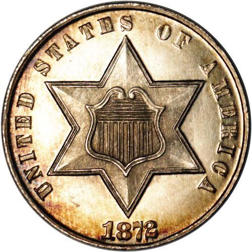 <B>1872<3CS>--Reverse Stained--NCS. Proof.</B></I> The obverse is essentially brilliant with pale gold at the border. The reverse exhibits warm golden-gray toning with the result that the mirror brilliance of the reverse field is subdued. Presumably, this is the basis for the NCS designation that the reverse is stained. Perhaps this piece would benefit from further conservation in order to restore the original blazing appearance.