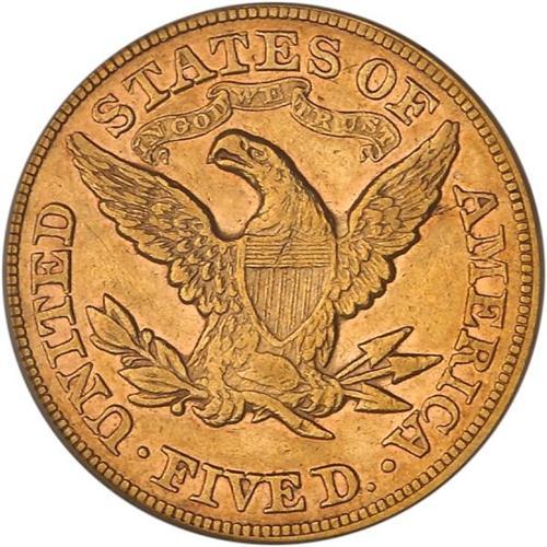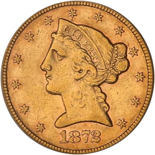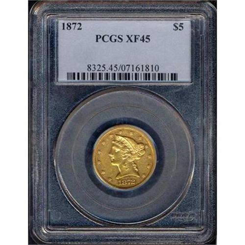 <b>1872 $5 Liberty. PCGS graded EF45.</b> After a sizable production of Half Eagles in 1861, only token quantities of that denomination were struck at the Philadelphia Mint between 1862 and 1872. Gold coins did not circulate during that era on the East coast and Midwest due to Gresham 's Law, and they were valued at a premium relative to dubiously backed Federal paper money. One may wonder why these very low mintage issues were struck at all. A possible reason may have been to reduce speculation on Proofs of the same date. Just 1,660 1872 Half Eagles were made, and only a small portion of these have survived. This is a nice example of a rare Philadelphia mint with traces of mint luster in the deeper devices and contact marks in accordance with the grade. PCGS has graded a total of 27 coins for this issue and no more. A scarce coin in any grade <b>(PCGS # 8325)</b>