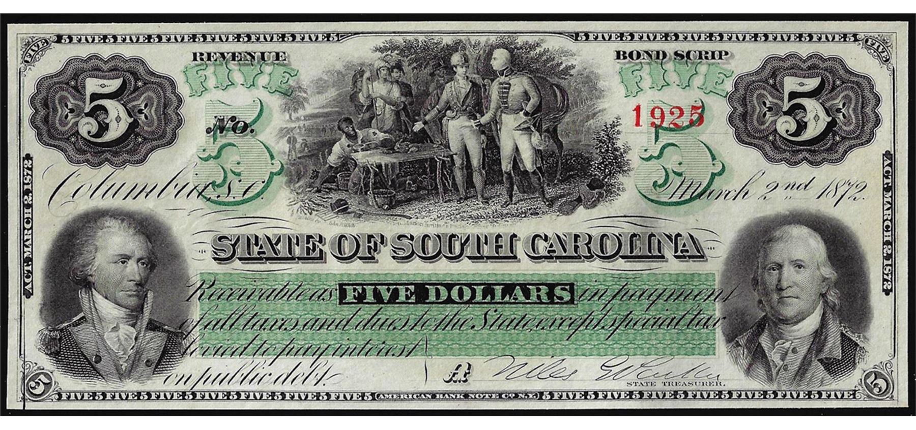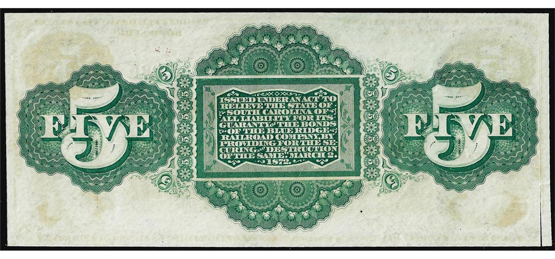 One 1872 $5 South Carolina Rail Road Company Obsolete Note with Cut down left margin.