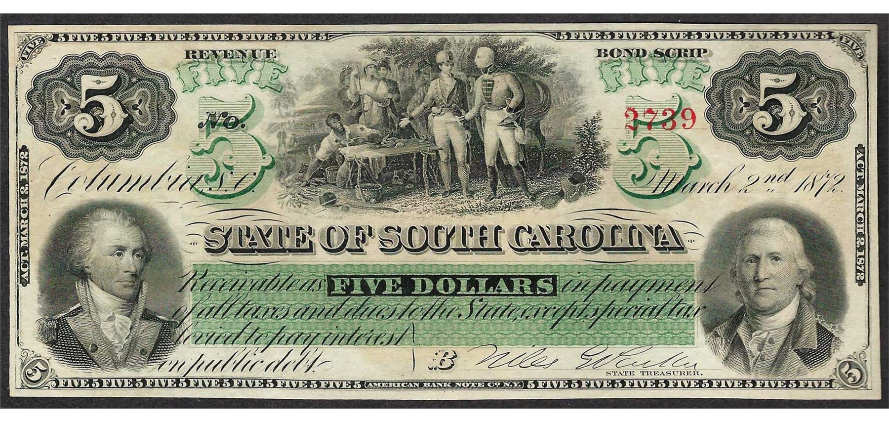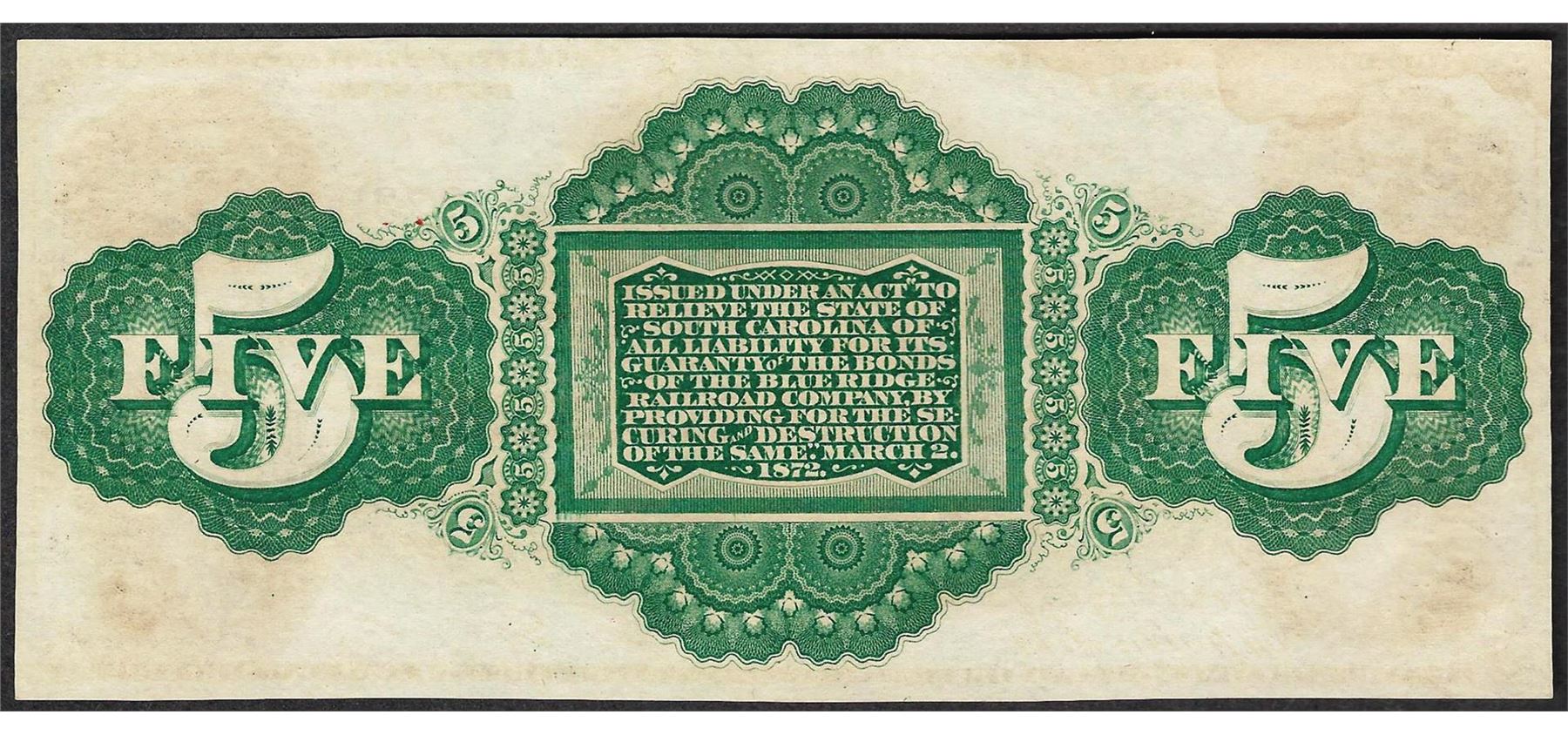 One 1872 $5 State of South Carolina Obsolete Bank Note.