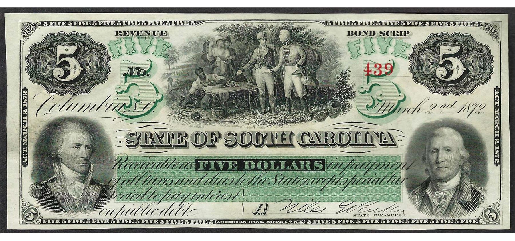 One 1872 $5 State of South Carolina Obsolete Bank Note.