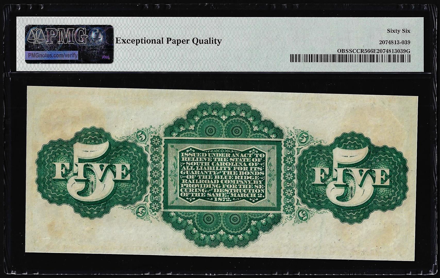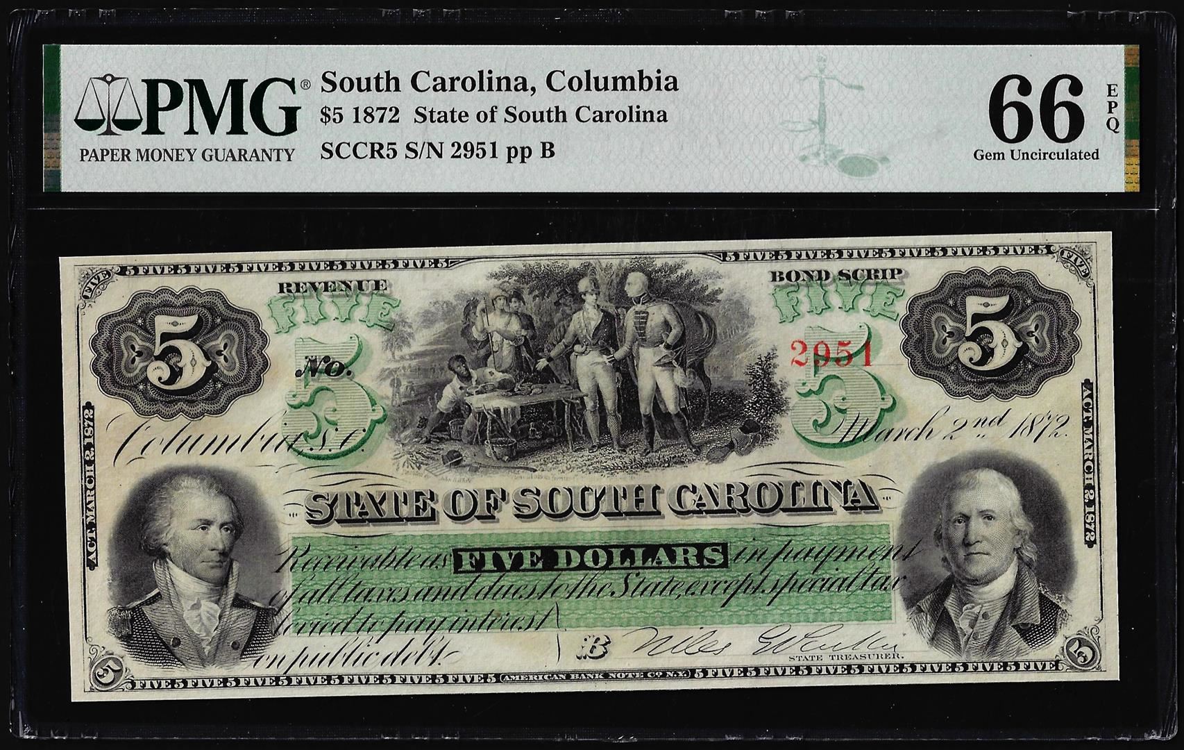 One 1872 $5 State of South Carolina Obsolete Note PMG Gem Uncirculated 66EPQ. PMG Certified.