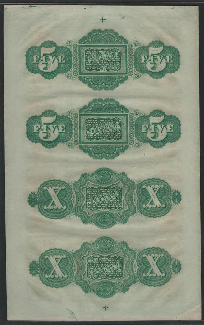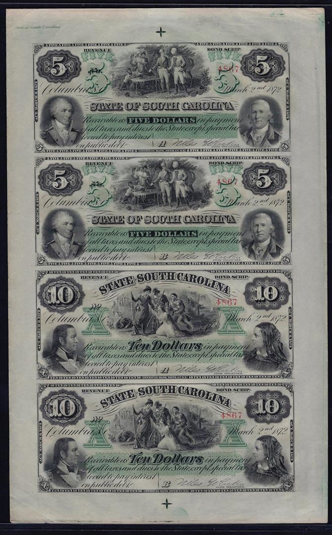 One 1872 $5 Uncut Sheet of State of South Carolina Obsolete Bank Notes.
