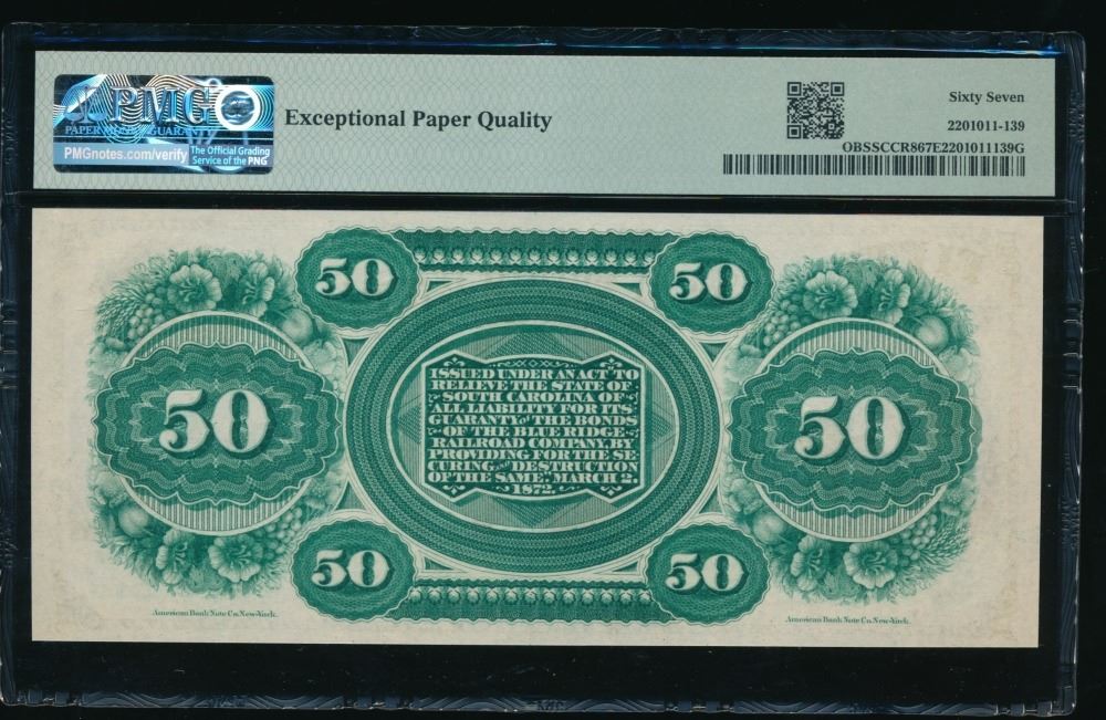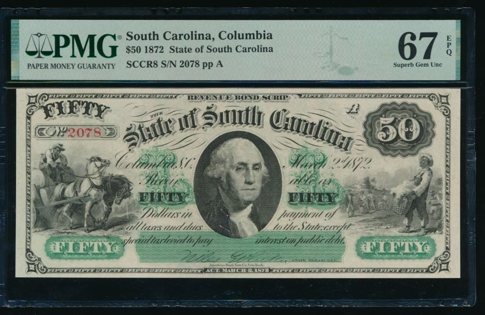 One 1872 $50 Columbia SC Obsolete Note PMG 67EPQ.