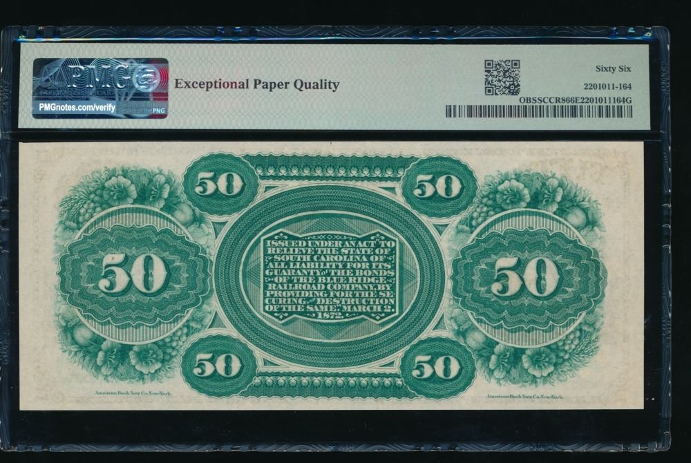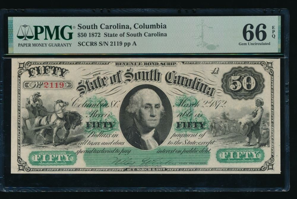 One 1872 $50 Columbia SC Obsolete PMG 66EPQ.