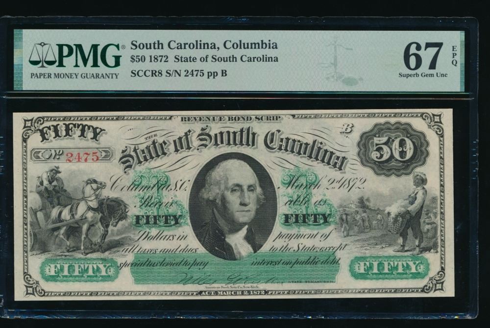 One 1872 $50 Columbia SC Obsolete PMG 67EPQ.