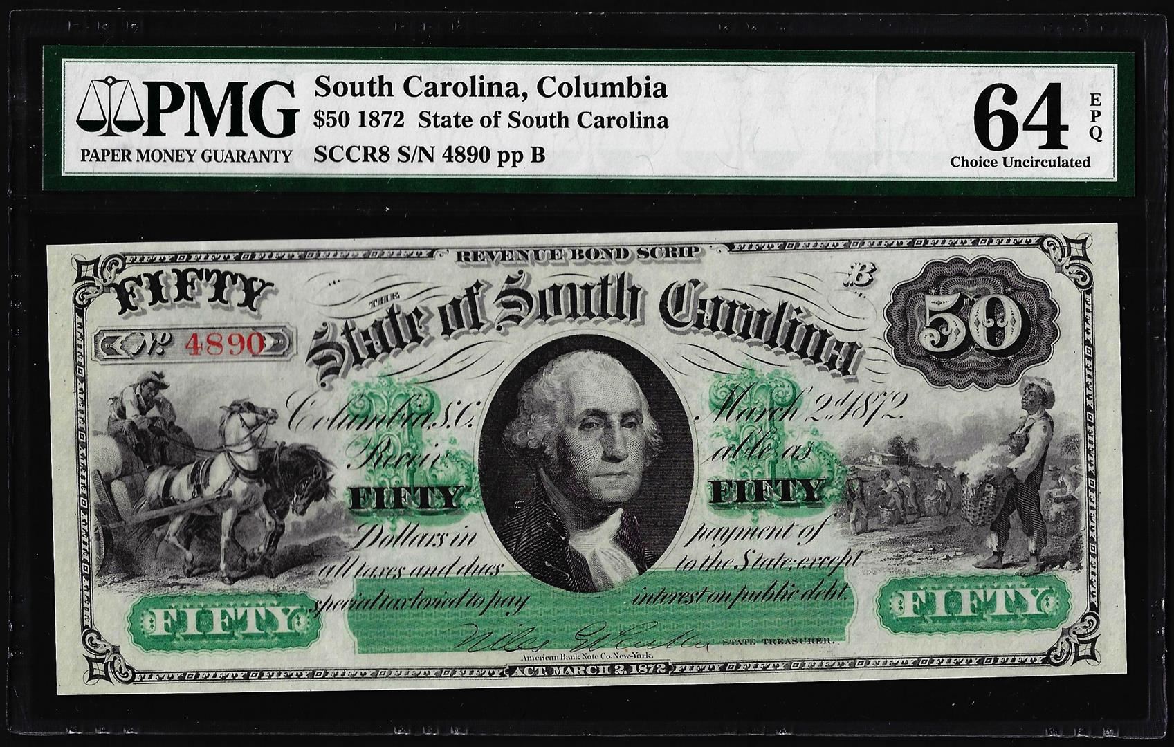 One 1872 $50 State of South Carolina Obsolete Note PMG Choice Uncirculated 64EPQ. PMG Certified.