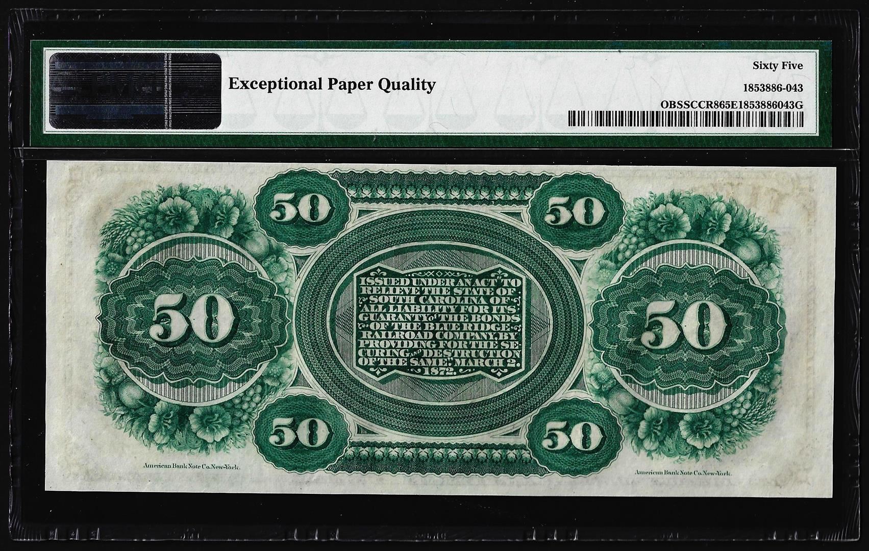 1872 $50 State of South Carolina Obsolete Note PMG Gem Uncirculated 65EPQ Low Serial