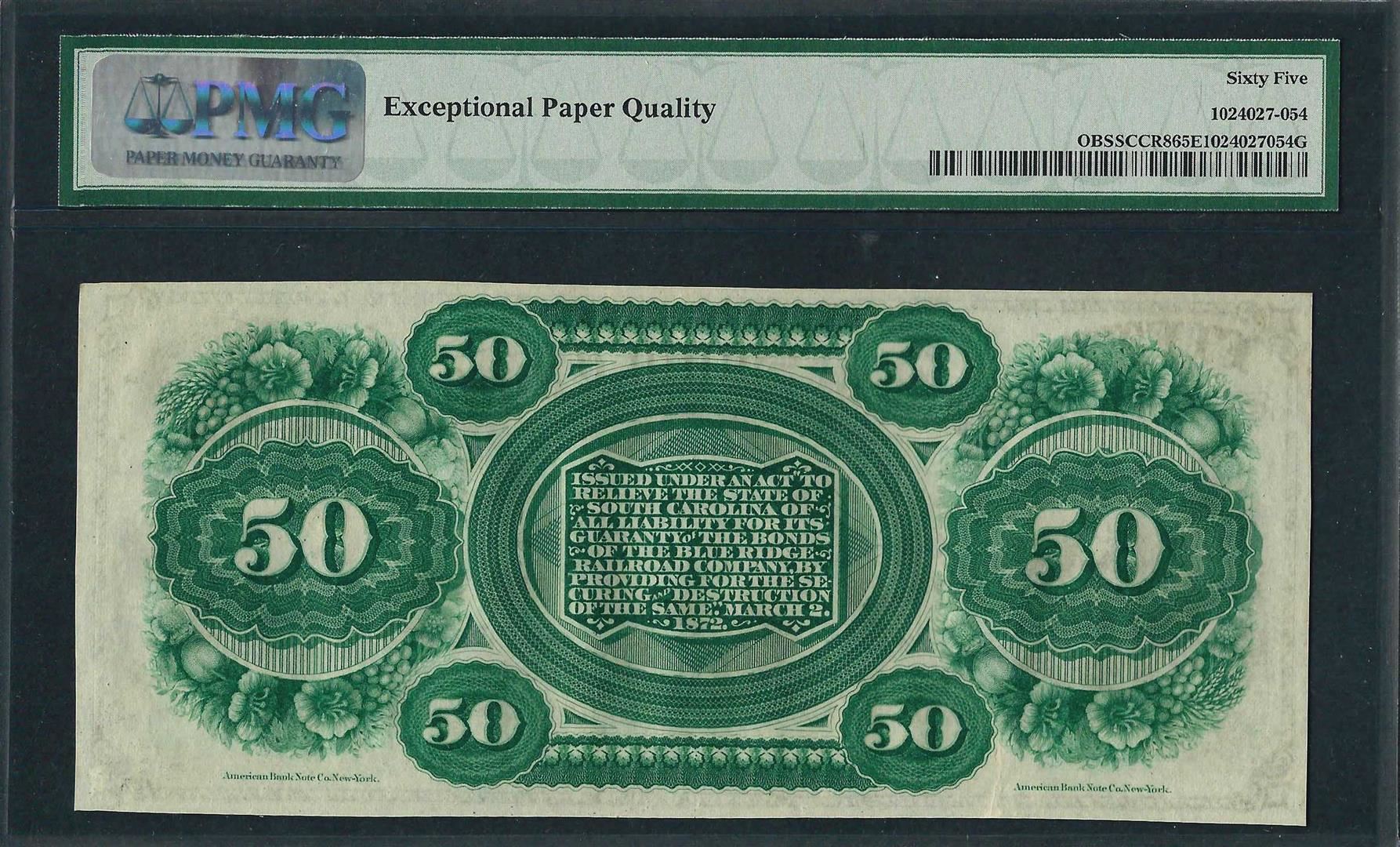One 1872 $50 State of South Carolina Obsolete Note PMG Gem Uncirculated 65EPQ. PMG Certified.
