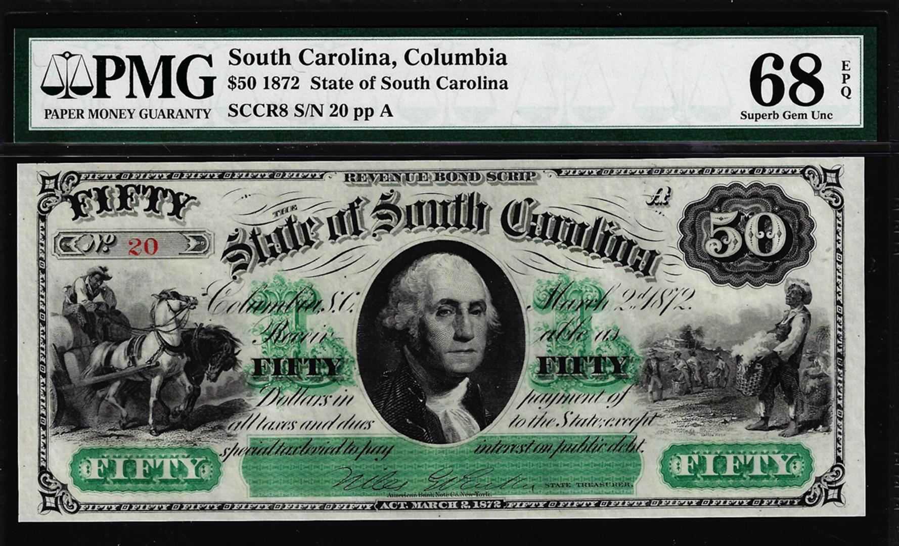 1872 $50 State of South Carolina Obsolete Note PMG Superb Gem Unc. 68EPQ Low Serial